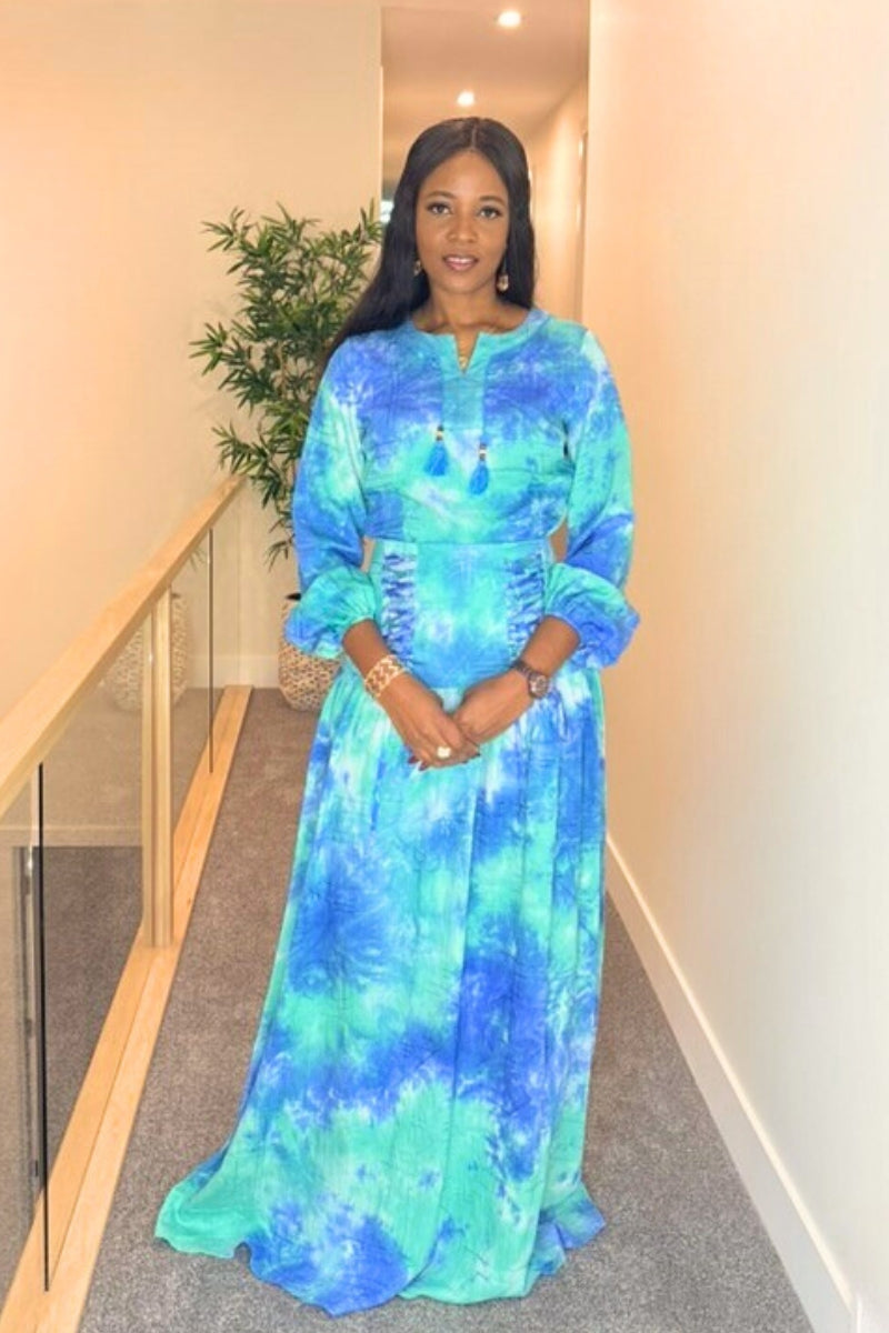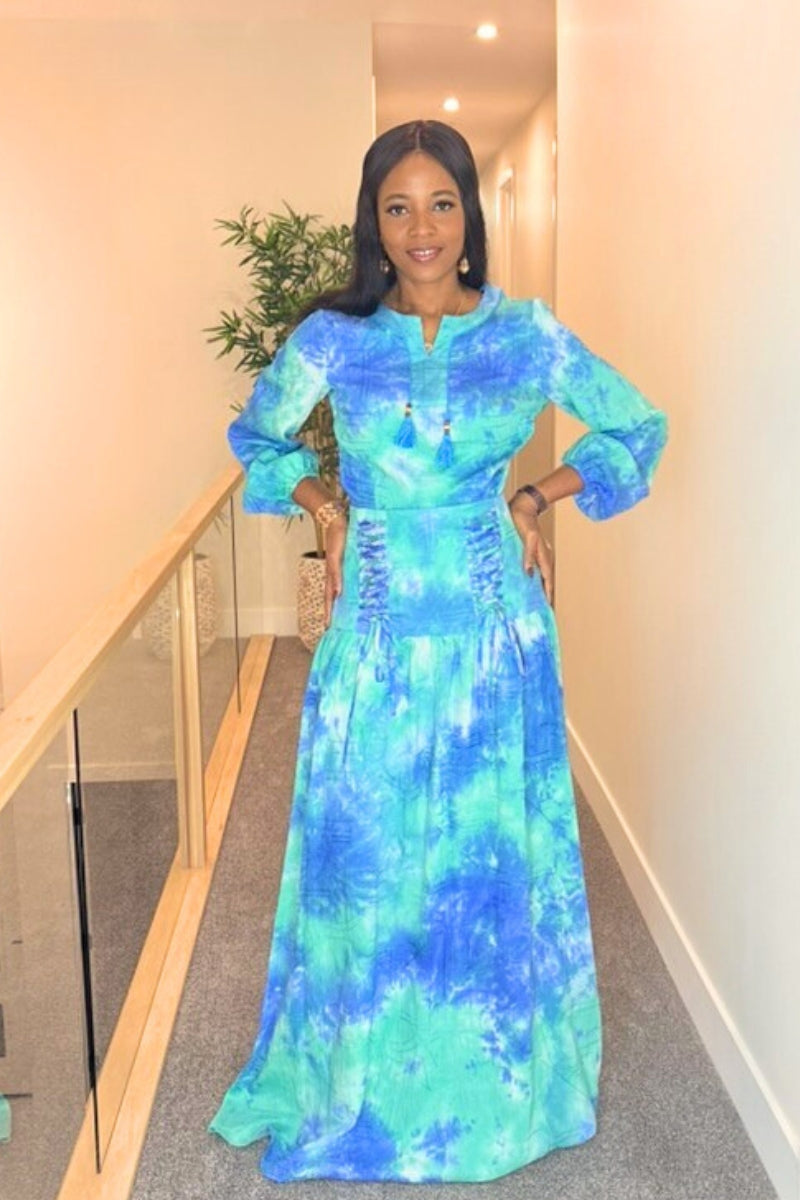 The Azure Tide Set pairs a flowing tie-dye maxi skirt with a coordinating tassel-detail top, creating a look that’s both vibrant and effortlessly refined. With its fitted waist and hip line, this set beautifully enhances your silhouette while offering breezy comfort and standout style.