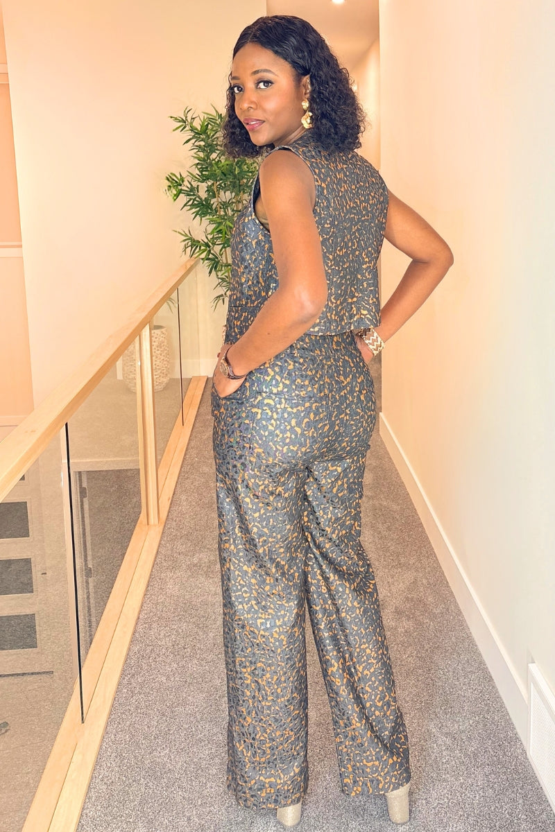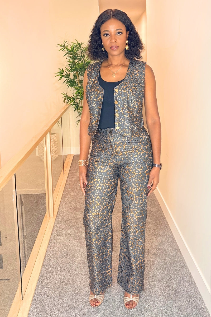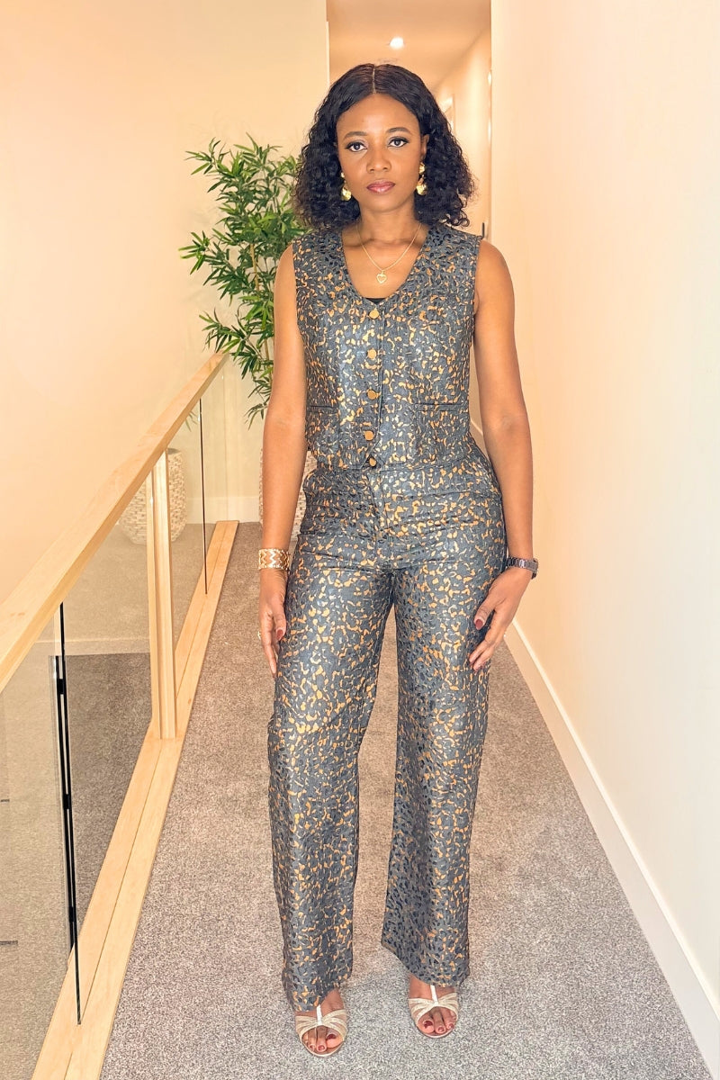 Denim Luxe is a two-piece pant set, crafted from denim material with a subtle gold-accent pattern throughout. The sleeveless top features a clean, structured fit and is finished with elegant golden buttons down the front. The matching high-waist pants have a straight, full-length cut that creates a sleek and flattering silhouette. The set offers a coordinated, polished look while maintaining comfort and versatility.